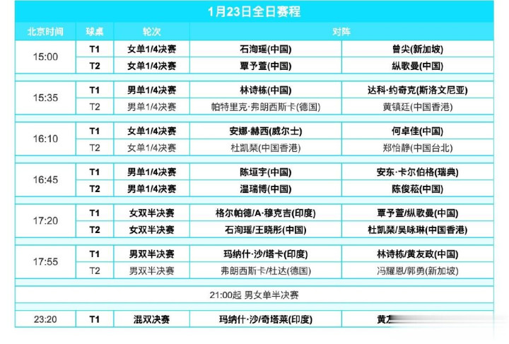 接下来就是男女单打4强和双打半决赛的比拼,1月23日赛程如下: