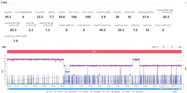 但到了《崩铁》果然就有点拉了,匹诺康尼全高画质 30 分钟跑图下来,Neo8 直接触发了 45 帧锁帧判定,所以导致我们没能测出更准确的平均帧率,只有 49.3 帧。。。