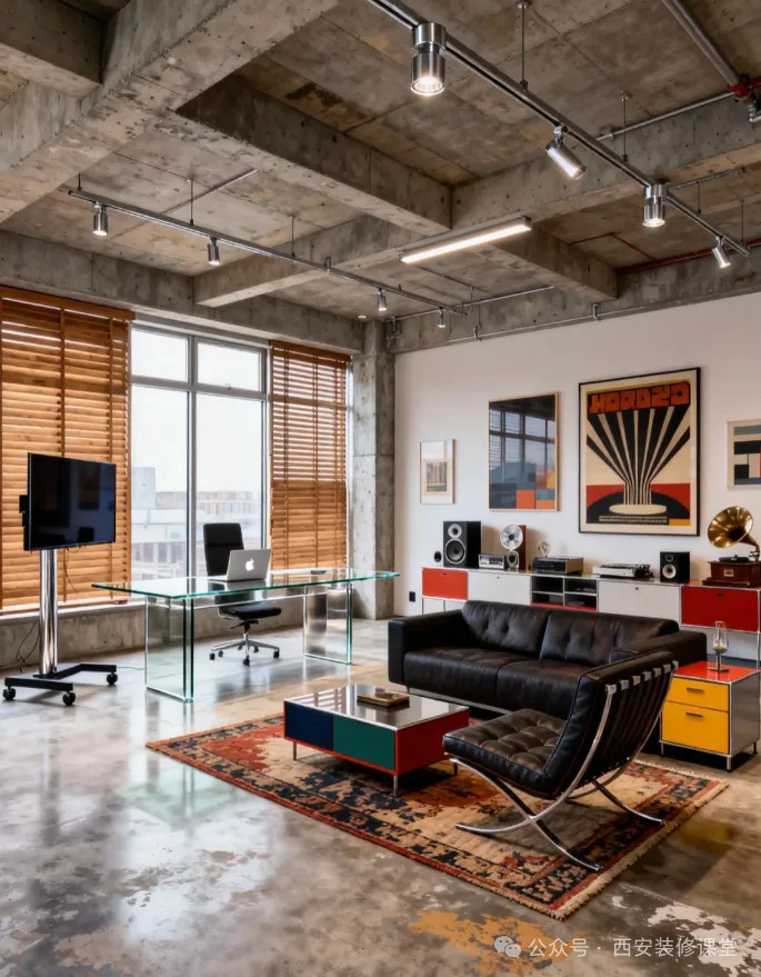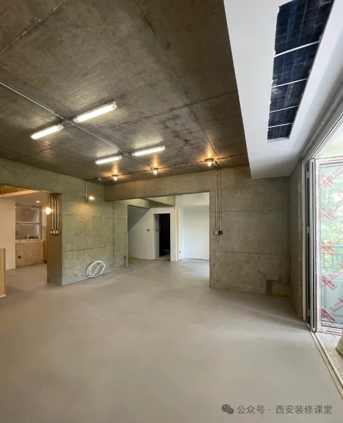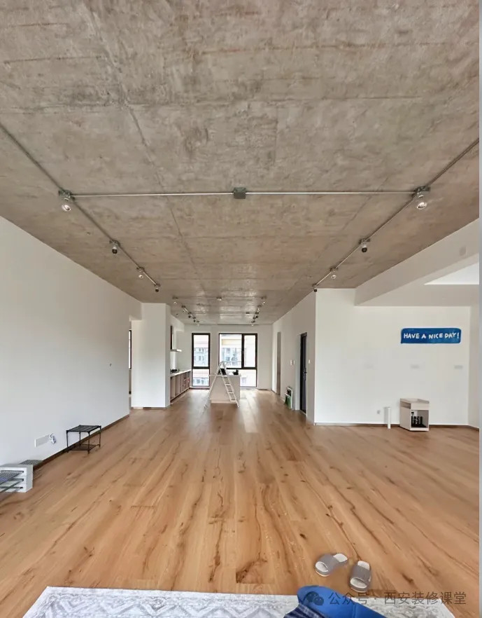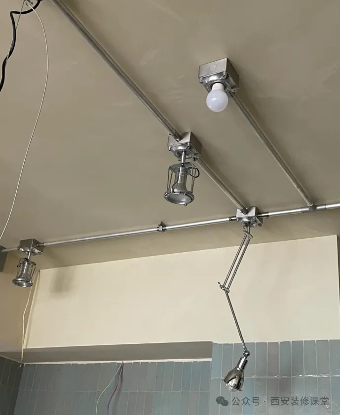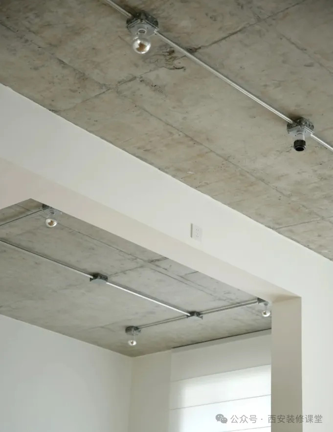 其实只是原顶混凝土然后做了罩面漆,大部分线路都是暗藏的,只有顶部的灯具以及线路采用明装形式。镀锌20管+底盒就可以实现金属的高级感。