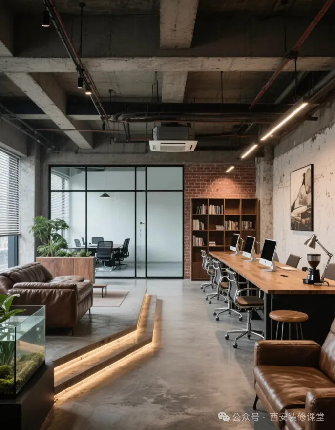 工业风在写字楼办公是常见做法,施工比较简单,也更好搭配。