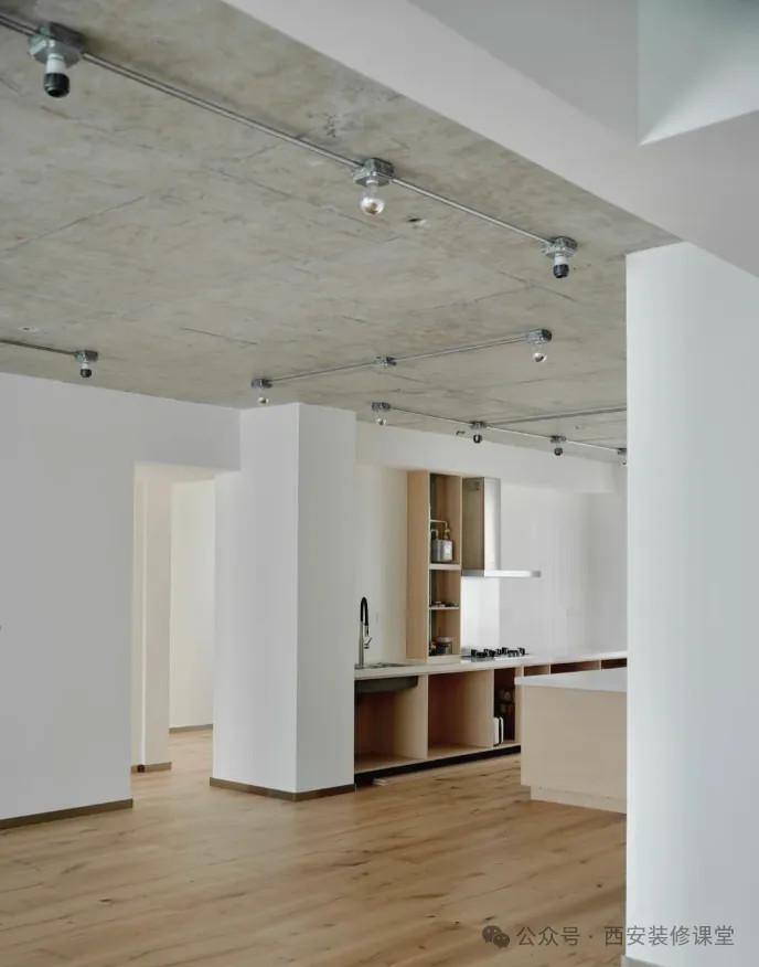 顶面水泥顶+秩序感的明装管,很有现代工业风的味道了,加上地面木地板的暖色调,中和一下刚好满足现代家居的氛围。