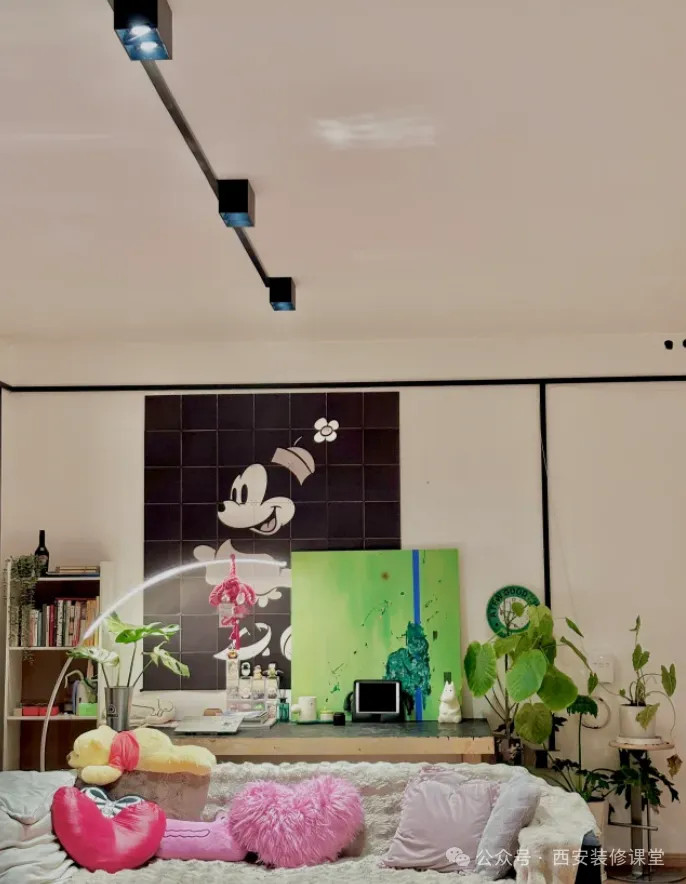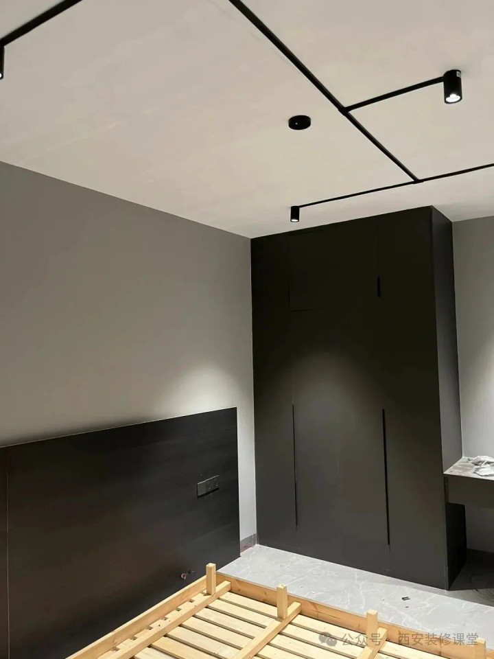 年轻人卧室喜欢另类,酷酷的黑色,米兰顶面采用黑色的明装线槽链接明装筒灯射灯,实现工业风的韵味。