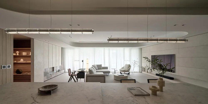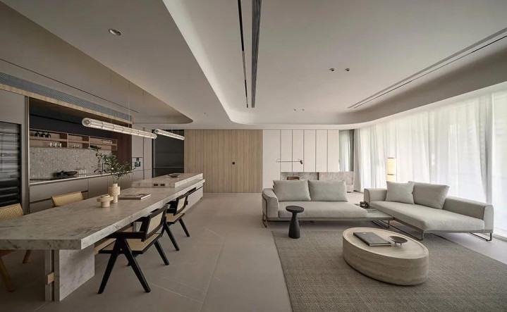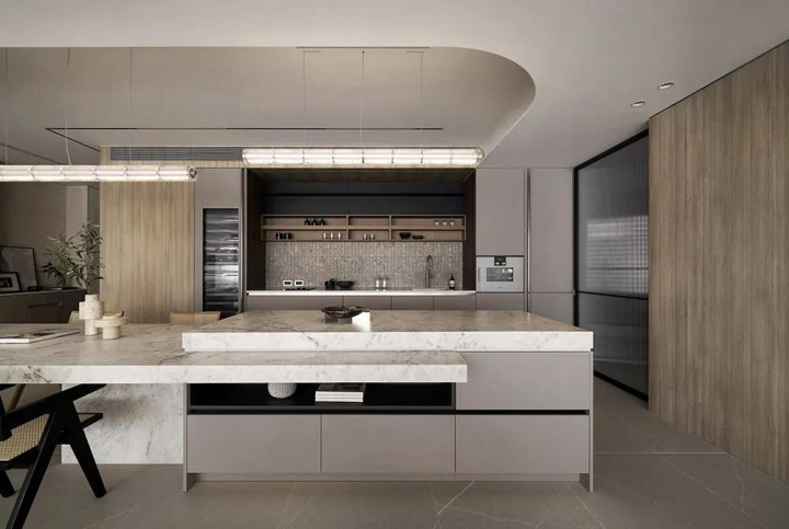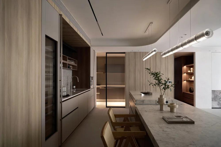 开放式餐厅以自然语言为主轴,简约利落的大理石中岛与餐桌相互层叠,材质的碰撞与空间的延展,共同构筑了一抹隐约的奢雅气息。