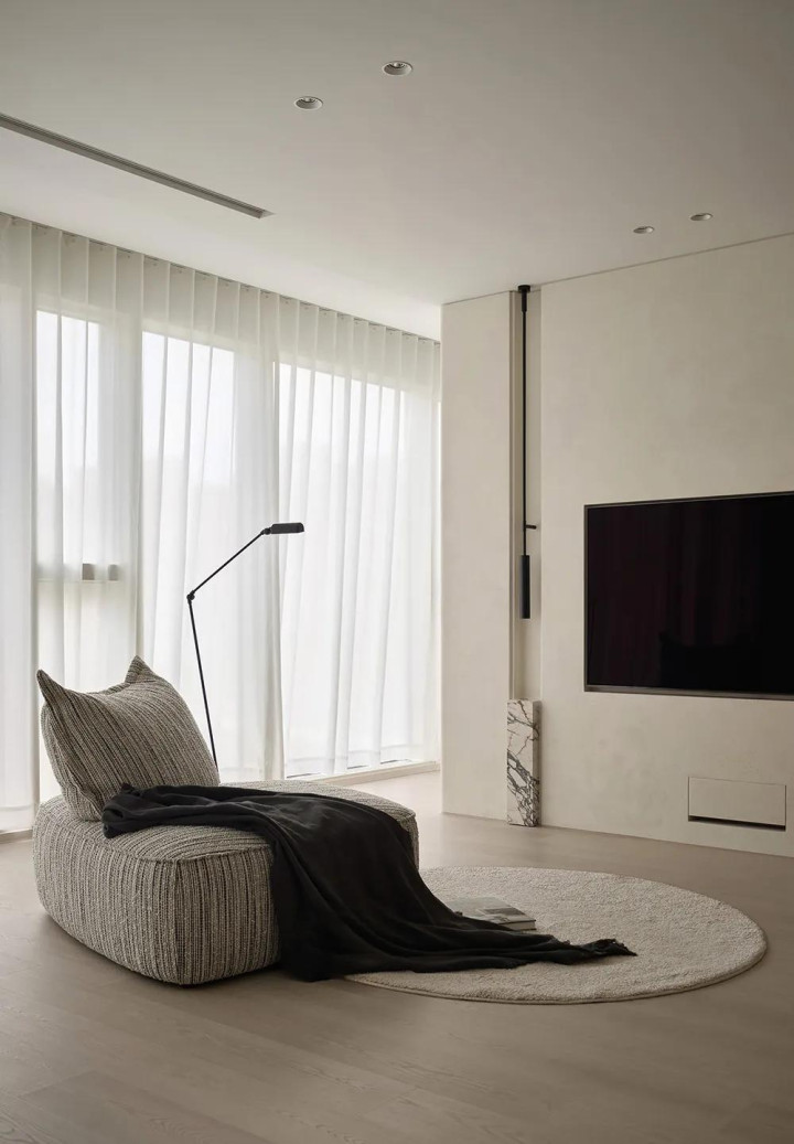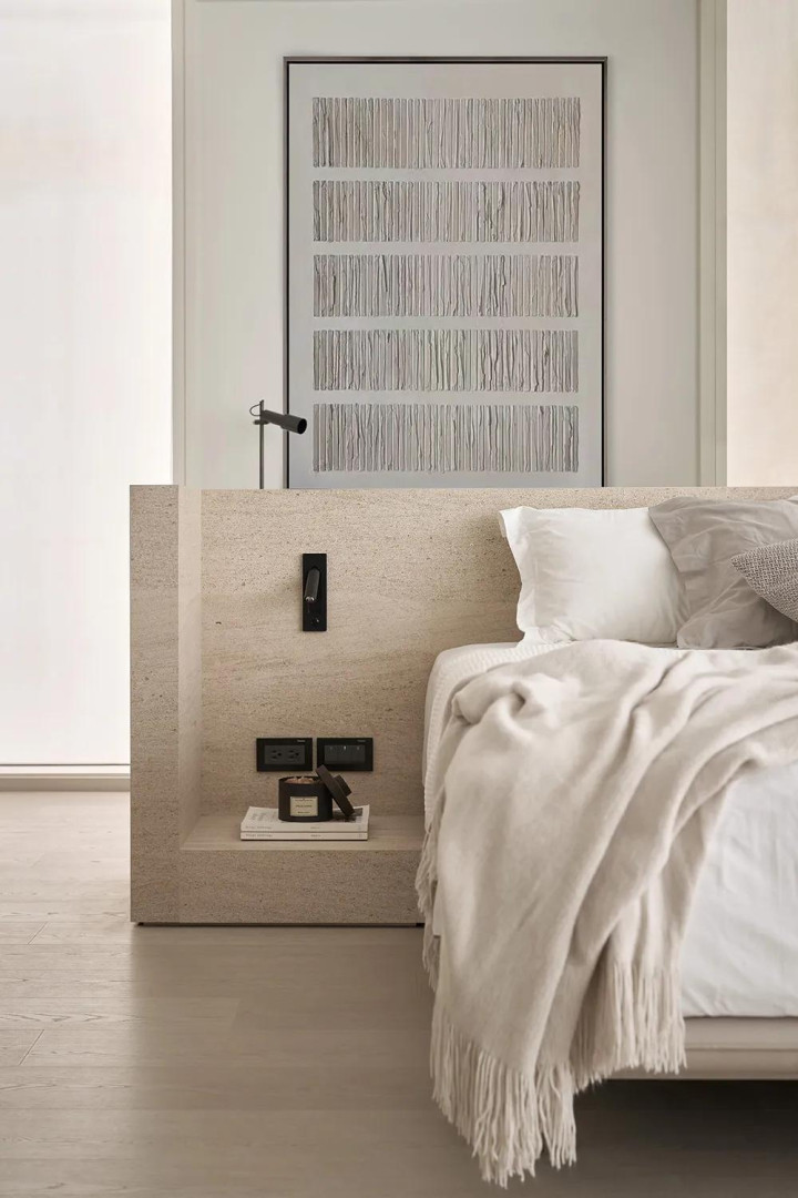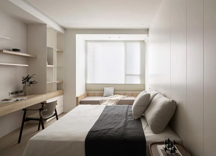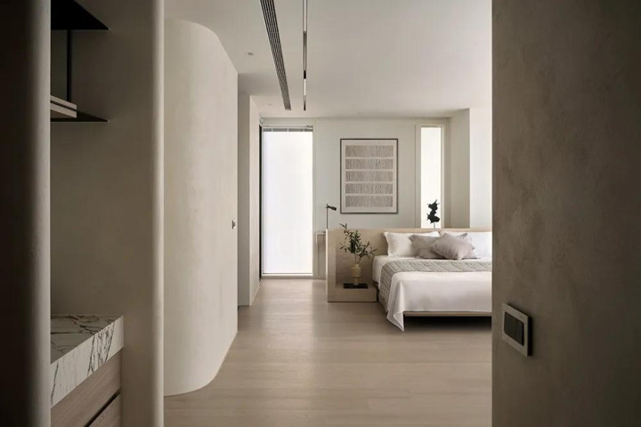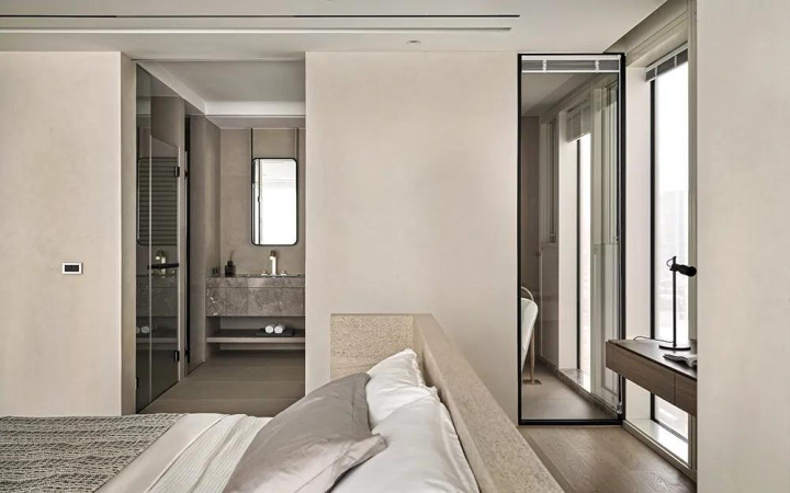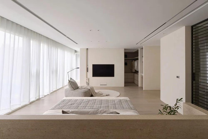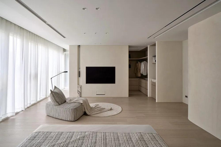 主卧空间以极简哲学为设计基调,摒弃多余的装饰性语言,专注于纯粹与实用之间的平衡。