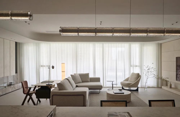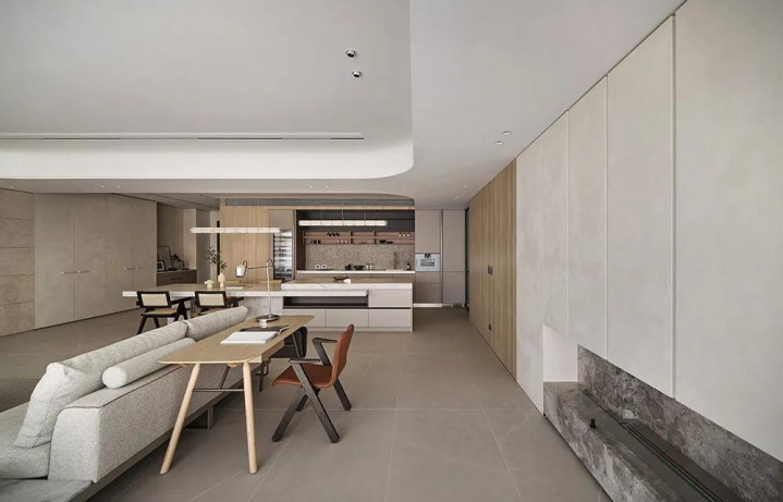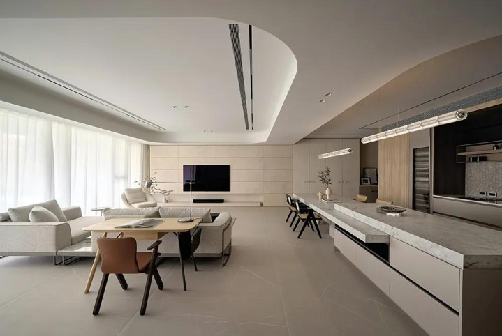 开放式设计串联客厅、餐厅与厨房功能,整体格局流畅通透,暖色系基调铺陈出家的温度,为一家七口创造了彼此共融的场所。