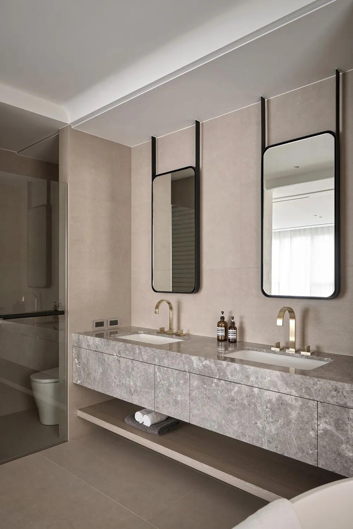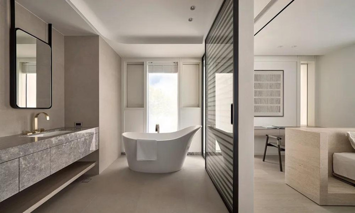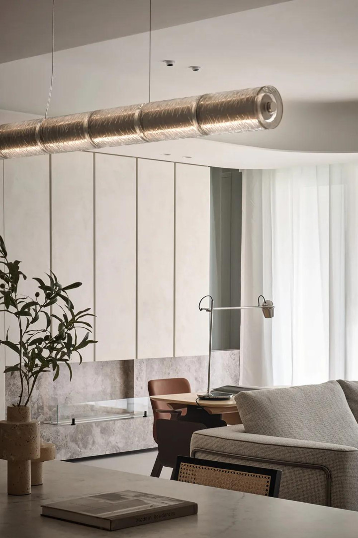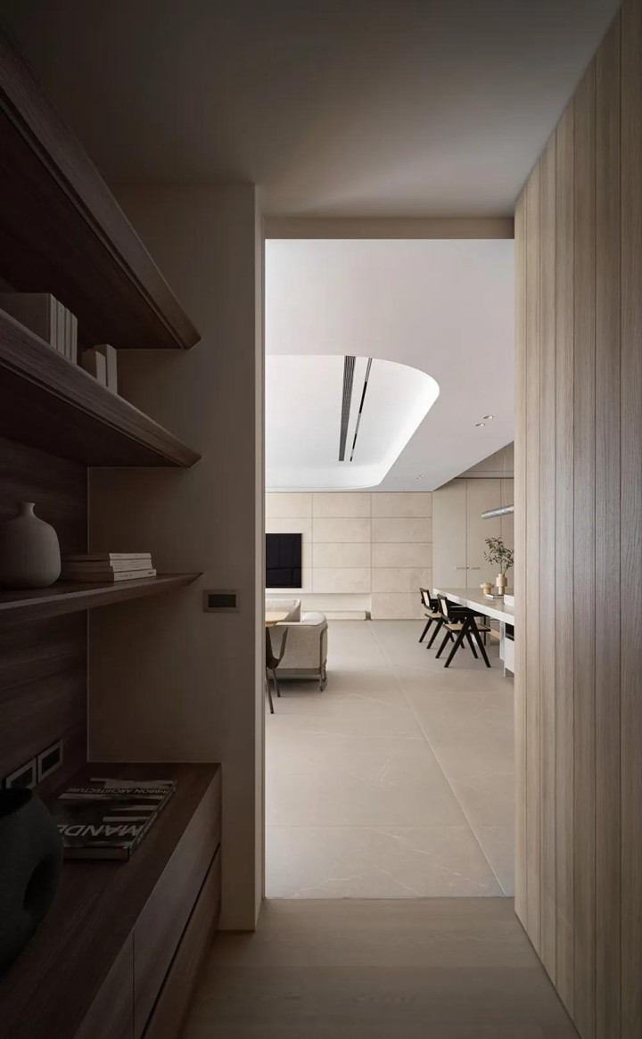 自然石材与温润木纹搭配,手刷纹理流淌于墙面与细节巧妙的光线融合交织,仿佛将自然的律动注入日常。
