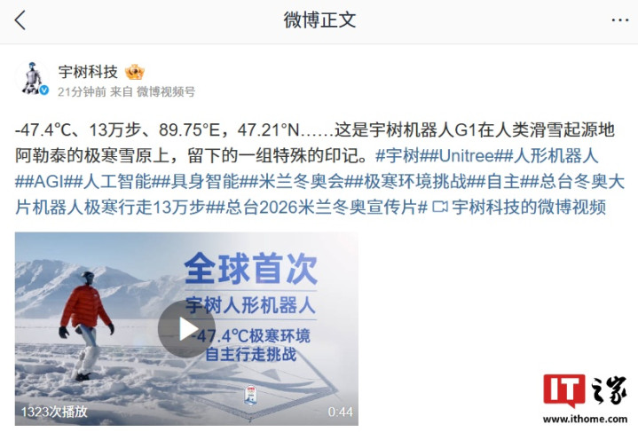 IT之家2月1日消息,央视新闻今日发布了2026冬奥预热视频,记录了全球首次人形机器人极寒天气下自主行走挑战。