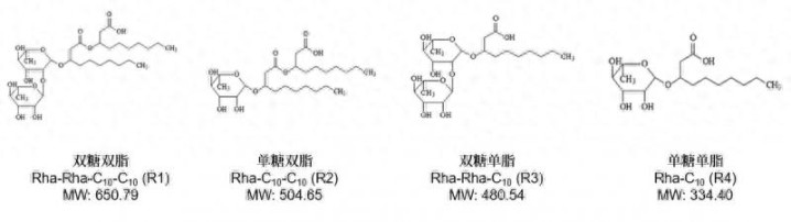 鼠李糖脂的分子结构由亲水的1~2分子鼠李糖环和疏水的1~2分子实足或不实足脂肪酸组成,其结构丰富,较为常见的有双糖双脂、单糖双脂、双糖单脂、单糖单脂四种结构。