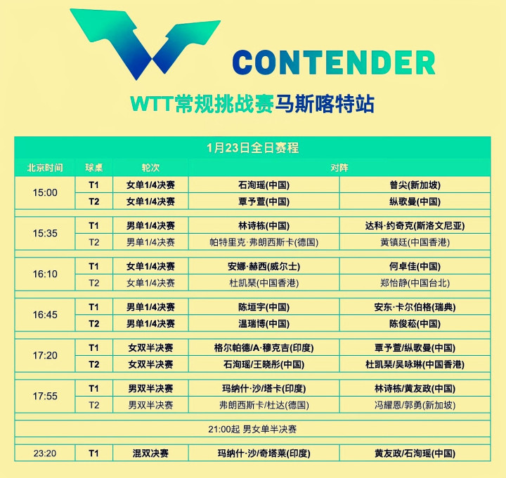 WTT马斯喀特常规挑战赛热战正浓,北京时间1月23日比赛进入倒数第二天。根据安排,今天将产生男女单打和男女双打的决赛名单,混双诞生本站首金。