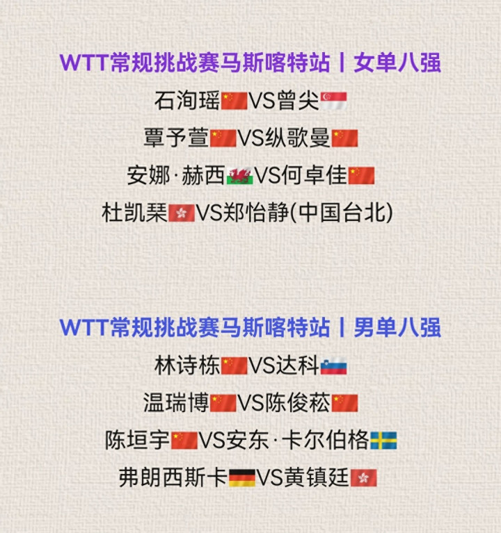 1月23日凌晨,马斯喀特常规赛单打8强全部出炉,国乒男女两线各占4席,理论上有包揽冠亚的可能。