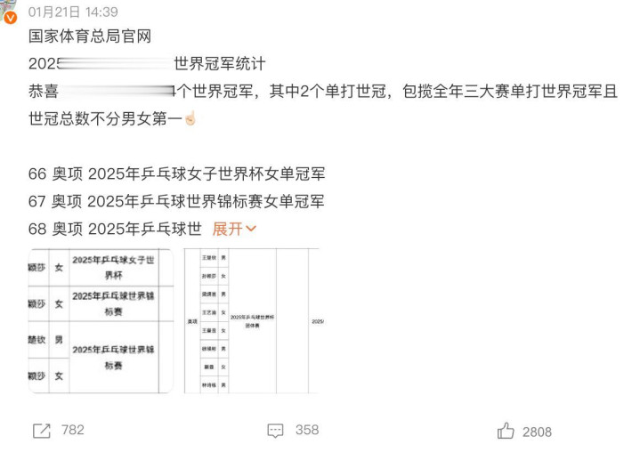 米兰体育官网 恭喜王楚钦孙颖莎, 体总公布2025年世界冠军统计, 莎头2项第一