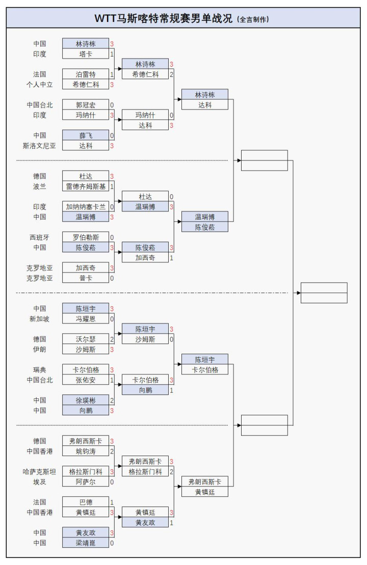 16:45男单后两场1/4决赛将拉开帷幕,国乒独守下半区的陈垣宇将直面瑞典奥运亚军卡尔伯格,后者过去打败过中国队主力王楚钦、梁靖崑,这次又淘汰向鹏,陈垣宇能否顶住压力存疑;另外两位在上半区的中国队选手温瑞博、陈俊菘则会展开内战,最近两人的状态都很不错,尤其温瑞博才在WTT多哈球星赛上摘银,作为特殊打法的陈俊菘想赢熟悉自己的队友晋级有难度。