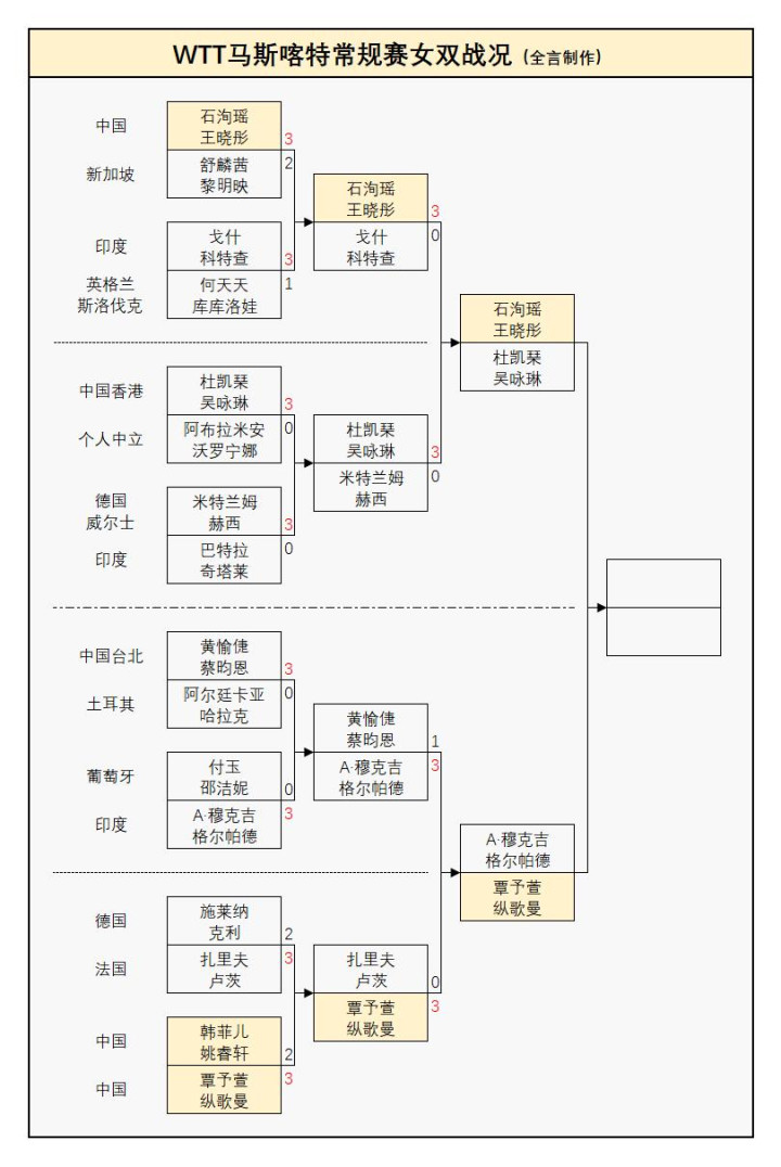 17:20女双半决赛开打,国乒两对组合覃予萱/纵歌曼、石洵瑶/王晓彤(中国)将分别与印度的格尔帕德/A·穆克吉、中国香港的杜凯琹/吴咏琳过招;17:55男双半决赛接踵而至,林诗栋/黄友政的对手是印度的塔卡/玛纳什,而此前淘汰梁靖崑/温瑞博晋级的新加坡组合冯耀恩/郭勇则会与德国的弗朗西斯卡/杜达(战胜世界排名第一黄镇廷/陈颢桦晋级)一较高下。