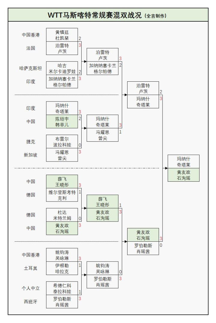 双打方面,国乒虽然有遭遇冲击而输外战,但三个项目均有组合过关,其中混双黄友政/石洵瑶已经晋级决赛,接下来将与印度的玛纳什/奇塔莱争夺冠军,男双林诗栋/黄友政也成功入围4强,女双在上、下半区各有一对选手闯入半决赛,分别是石洵瑶/王晓彤、覃予萱/纵歌曼,存在包揽冠、亚军的可能:
