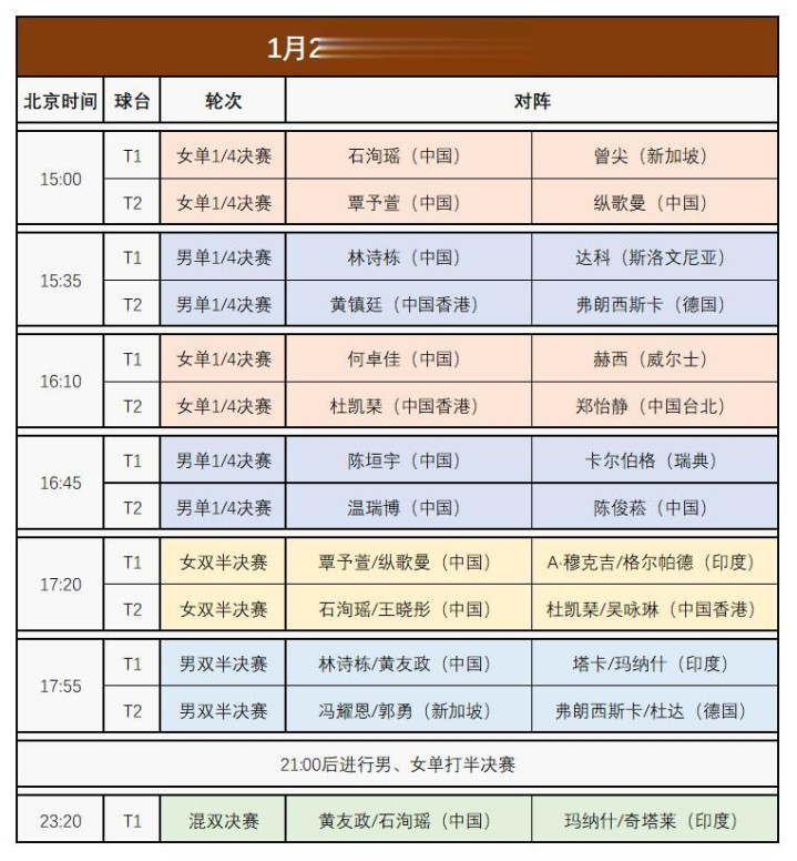 如前所说,1月23日还会进行男、女单打半决赛的较量,不过由于4强名单还没有出炉,所以我们暂时不清楚对阵的安排,而在此之后,23:20将迎来混双的金牌争夺战,国乒组合黄友政/石洵瑶将与印度的玛纳什/奇塔莱展开决赛,就个人实力而言中国选手无疑更强,但印度运动员的打法很有特色,未必不能出奇制胜,那就让我们一起坐等新的比赛结果出炉吧!