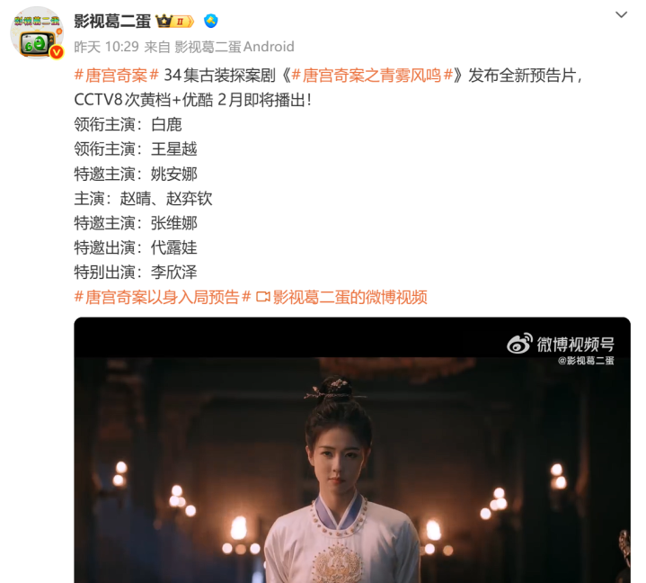 《唐宫奇案之青雾风鸣》(以下简称《唐宫奇案》)预计也会在2月份正式在央视跟观众见面,顶流坐镇,又是热门的古装悬疑题材,看样子是打算霸屏了,那么该剧到底凭啥这么横?