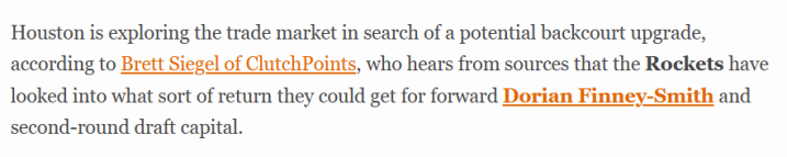 北京时间1月23日,据名记西格尔报道,休斯顿火箭队正试水交易市场,寻求补强球队后场实力。消息人士透露,火箭方面已在评估,若将锋线球员芬尼-史密斯与次轮选秀权作为筹码,能够换回怎样的交易回报。