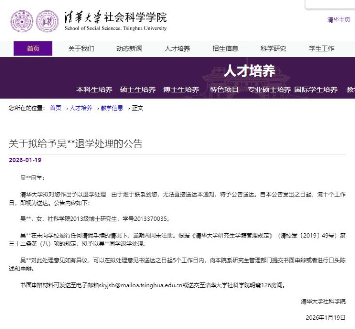 近日,清华大学官网发布通告,对两名博士研究生作出予以退学处理,内文如下: